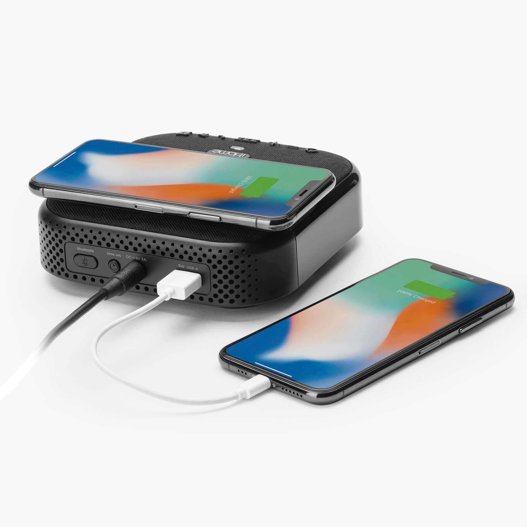This alarm clock with wireless charging makes it easy to live life recharged. The Qi-certified wireless charging pad works with compatible iPhone (5W) and Android (10W) smartphones, plus, you can power up your other devices simultaneously using the built-in 5W USB charging port. Connect any mobile device to the built-in wireless speaker to stream your favorite playlists, podcasts, audiobooks, and more. Use the speakerphone function to answer and end calls with ease when your smartphone is connected, too. Personalize your sleep routine with a variety of features that can be programmed in a few simple steps. Dual alarms can be set and used independently to wake to Bluetooth audio or preset tones. Customize your alarm schedule, too - select weekdays only, weekends only, or 7 days a week. Plus, the intelligent clock display will automatically dim to suit the lighting in your room. If you are shopping for an alarm clock with wireless charging for your bedroom, the iHome iBTW22 provides a space saving solution that will complement any bedroom décor.